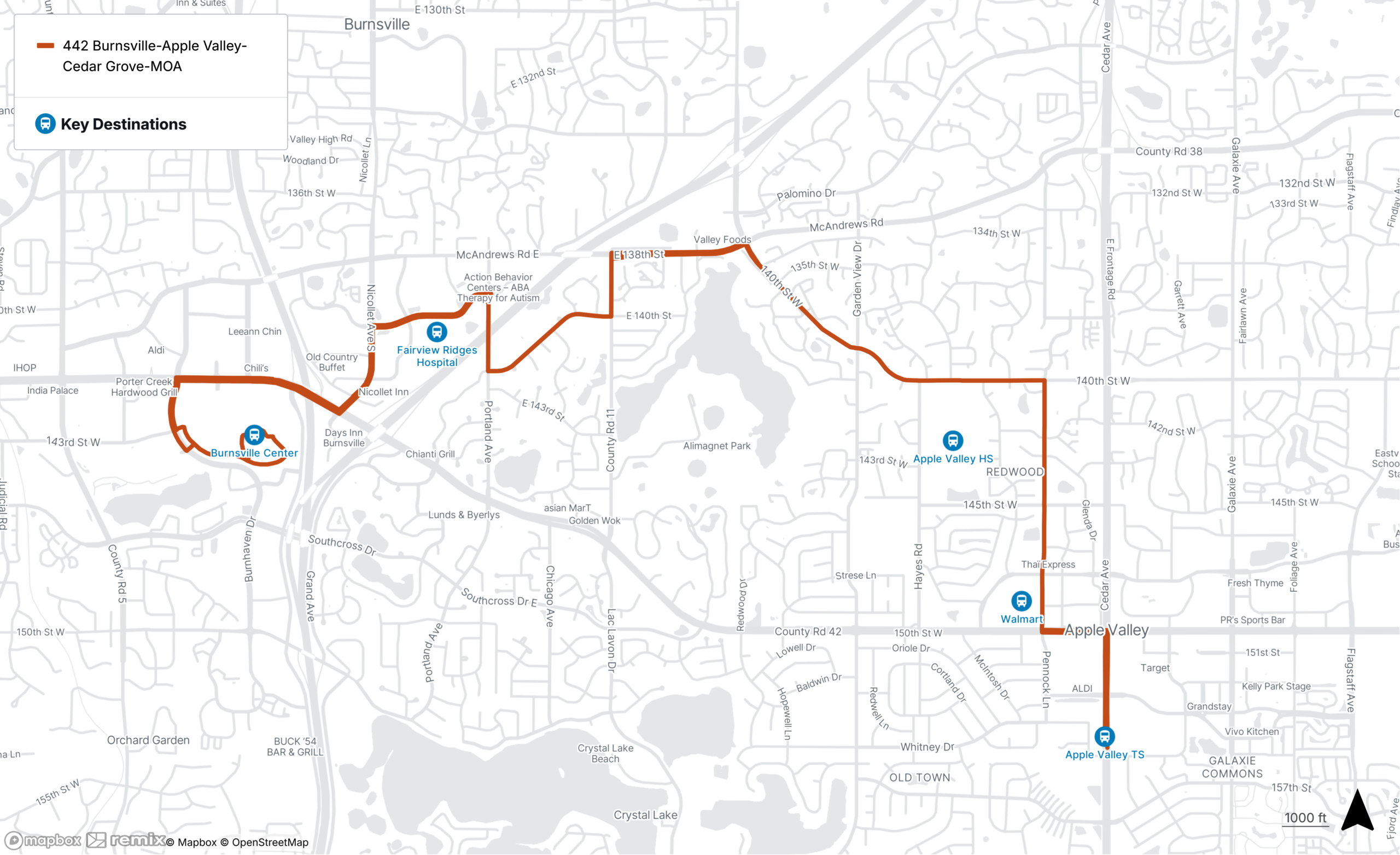 Service on Route 442 between Apple Valley Transit Station and Mall of America will be discontinued. Alternative service is available via Route 440 and METRO Red Line. Stops on Garden View Dr and Whitney Dr will also be removed, and Route 442 will serve stops on Pennock Ave. Trip times will also be adjusted, with hourly service on weekdays between 6 AM and 8 PM and weekend service between 8 AM and 8 PM. Eastbound trips will end at Apple Valley Transit Station Southbound station and Westbound trips will begin at Apple Valley Northbound station. Visit the routes page for more information.