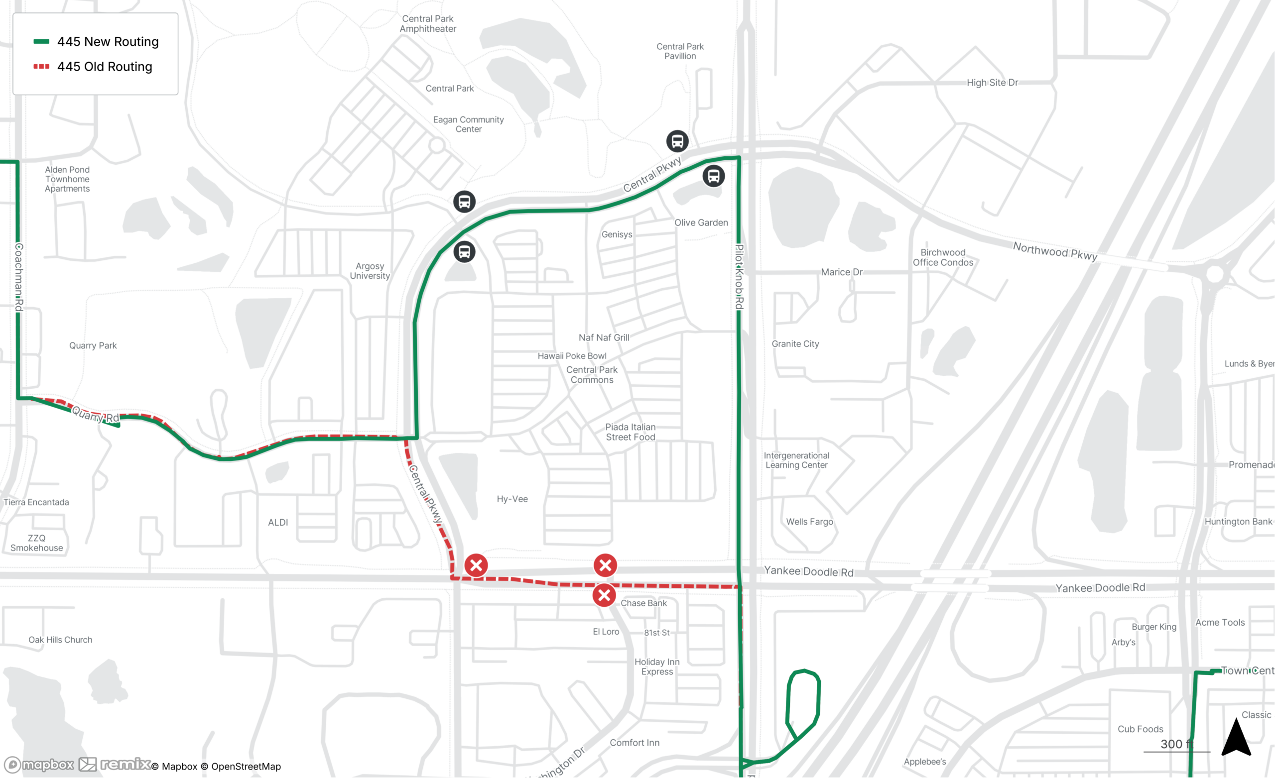 Route 445 will be adjusted to provide more accessible stop locations to Eagan’s Central Park to better serve events and activities at the park. Stops will be added at Central Pkwy and Towerview Rd (#30125, #30124) and at Central Pkwy and Pilot Knob Rd (#30123, #30126). Stops at Yankee Doodle Rd and Washington Dr (#30625, #30563) and at Yankee Doodle Rd and Central Pkwy (#30564) will be removed. Timing changes will occur on route 445 as a part of this change. Visit the routes page for more information.