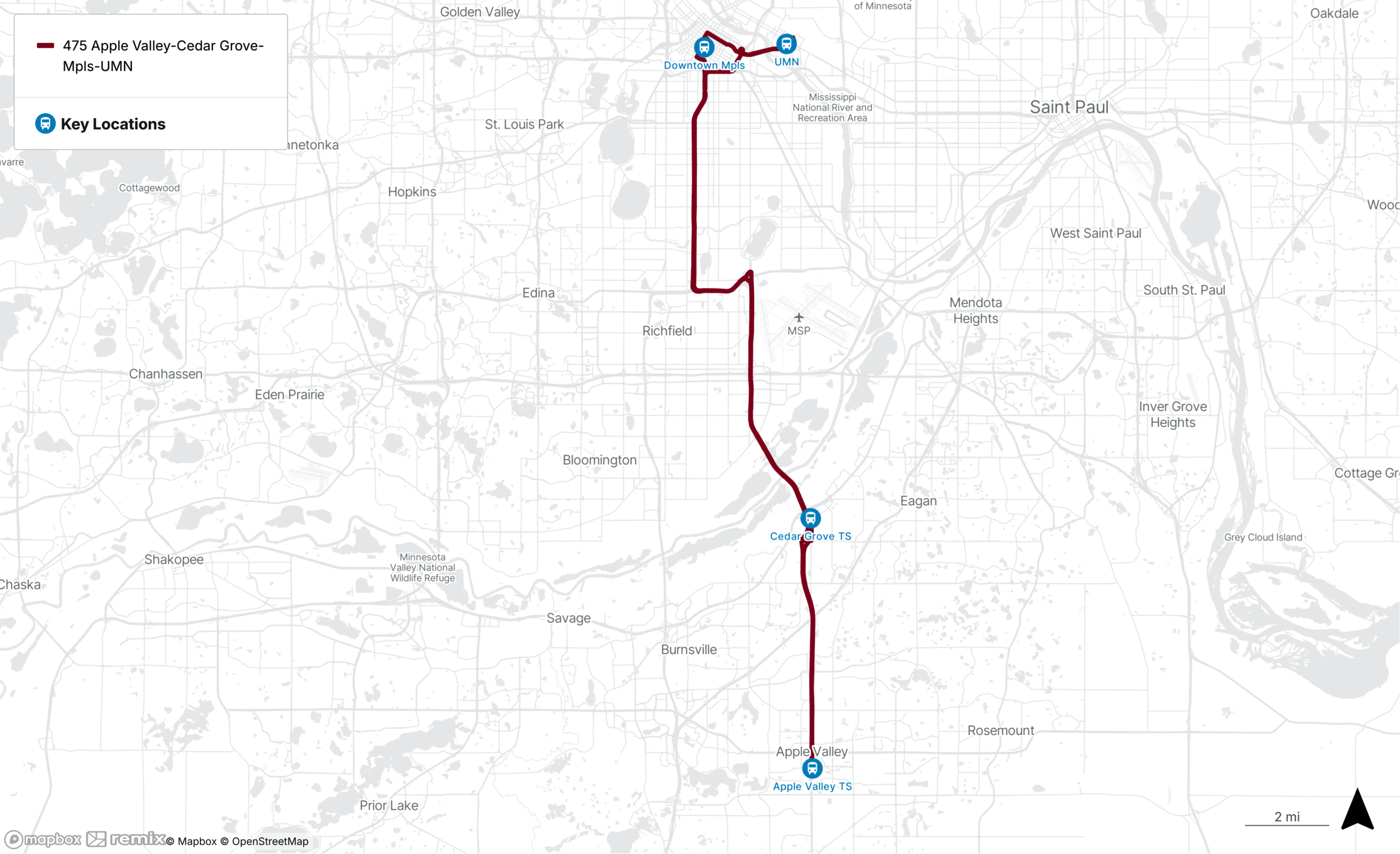 Service to the Minnesota Zoo stop on midday 475 trips will no longer be provided. Southbound trips after 7 PM will be adjusted to have stops in Downtown Minneapolis to provide late night options to workers and residents. Trip times will also be adjusted in both directions. Visit the routes page for more information.