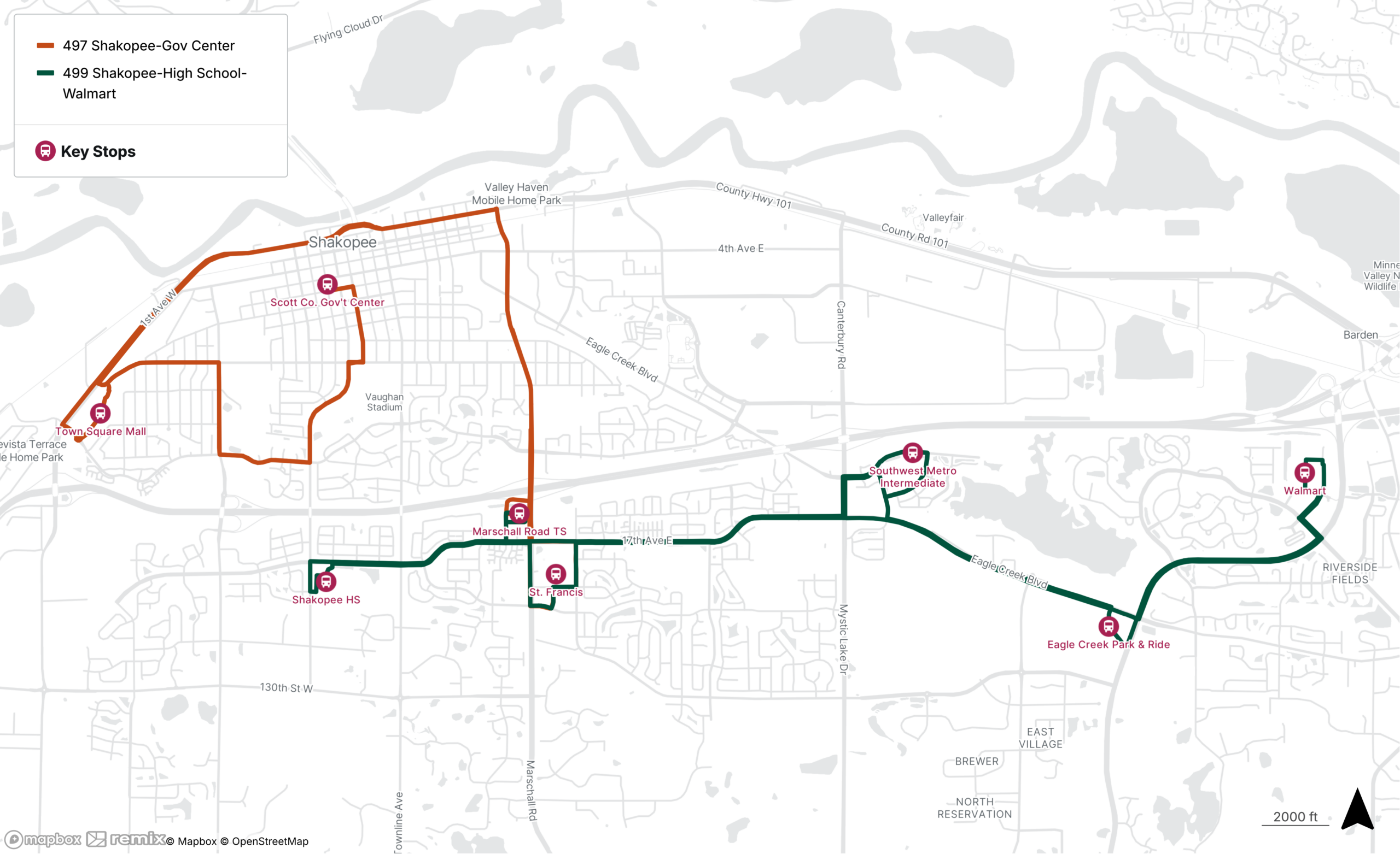 Route 499 will be altered to streamline service between Marschall Road Transit Station and destinations in East Shakopee. Stops along Vierling Dr, near Canterbury Park, in the Valley Industrial Park, and at Mystic Lake Casino will be removed. Service to Canterbury Park and Mystic Lake Casino will be replaced by service on an updated 4FUN/495 route (see below). New stops will be provided at St. Francis Hospital, 17th Ave, and Eagle Creek Park & Ride. Service will continue to be provided to Shakopee High School on “H” pattern trips.
