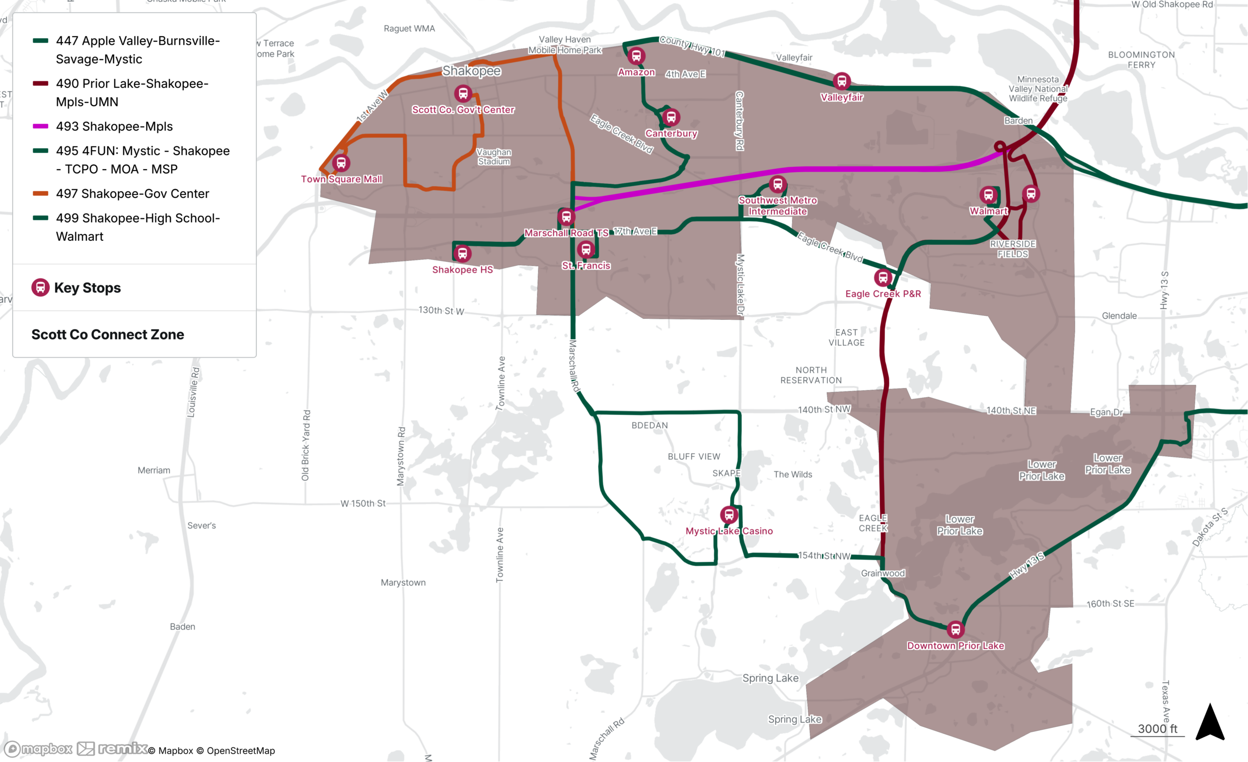 Fixed route service to the Canterbury Park area, Marschall Road Transit Station, and Mystic Lake Casino will be available via alterations to the enhanced 4FUN route.