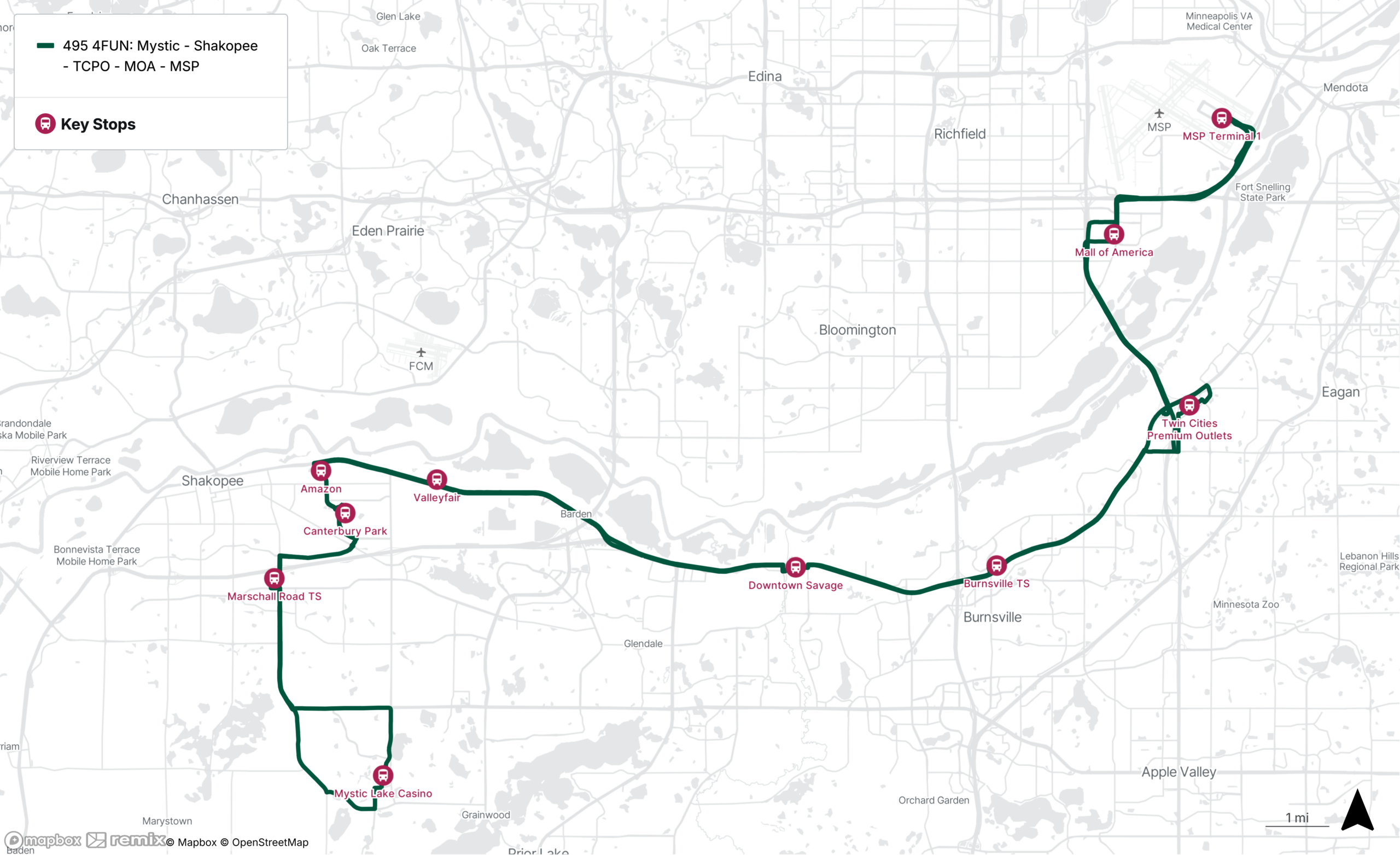 The 4FUN Route will add destinations previously served by Route 495. Trips will operate hourly between 3:30 AM and 11:30 PM. Mystic Lake Casino trips will be served by Westbound trips in the AM and Eastbound trips in the PM. Trip times will be the same on weekdays and weekends and fares will be $2 (local fare cost). Service to Valleyfair will begin when the park opens for the year in May. 4FUN also will expand service to downtown Savage all day long. Visit the routes page for more information.