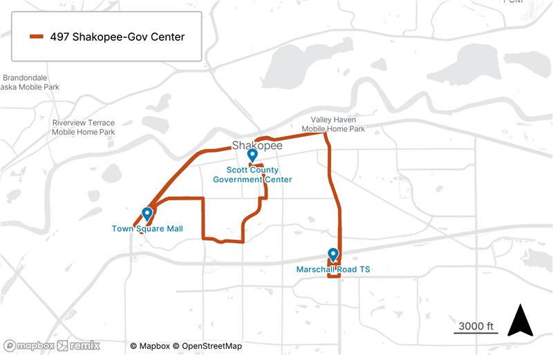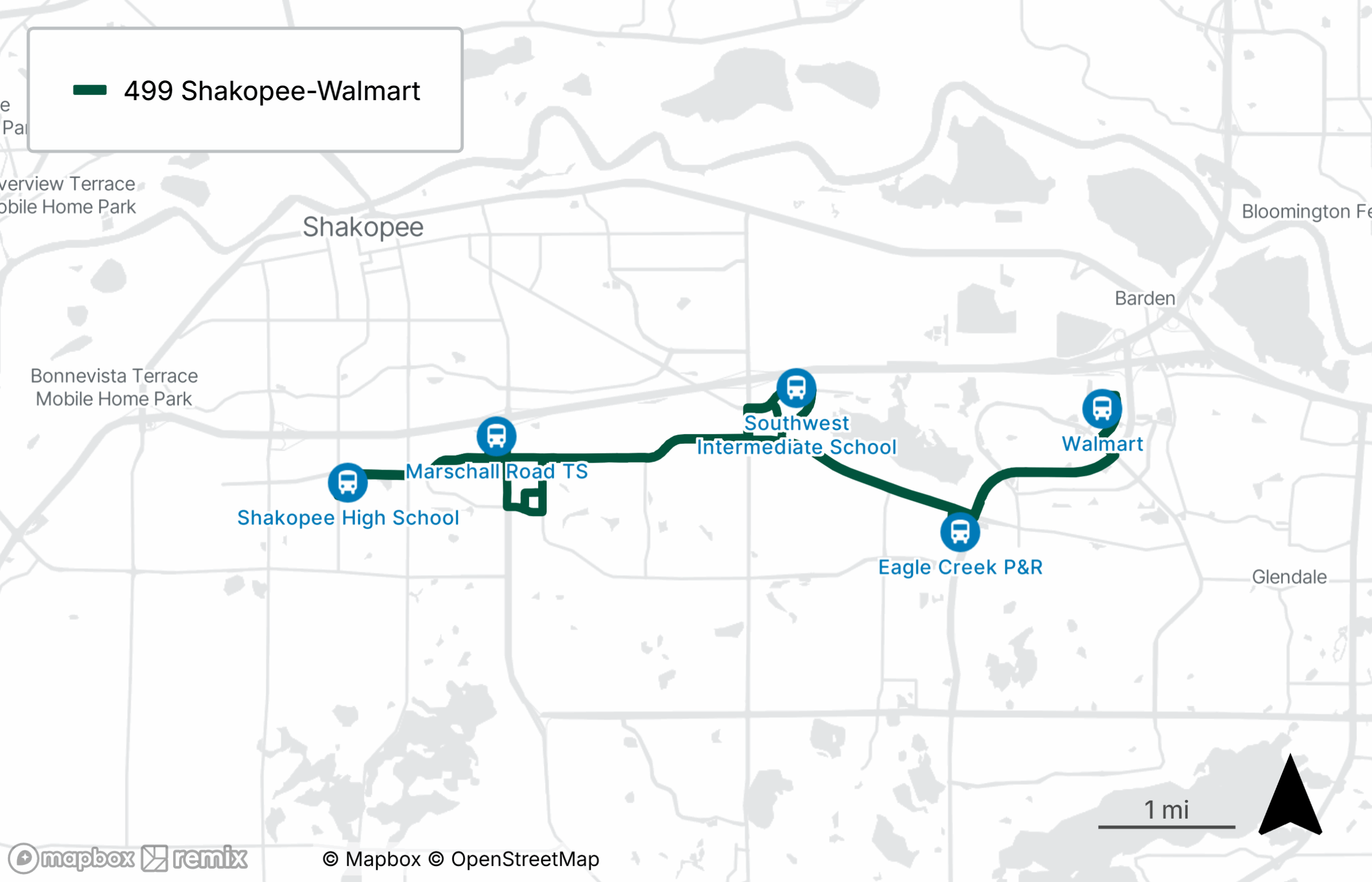Route 495 currently operates between Shakopee and MSP Terminal 1 with other stops in Savage, Burnsville, and Mall of America. Select trips also serve Amazon and Mystic Lake Casino. The route operates every 120 minutes on weekdays and weekends, with some added trips throughout the day.