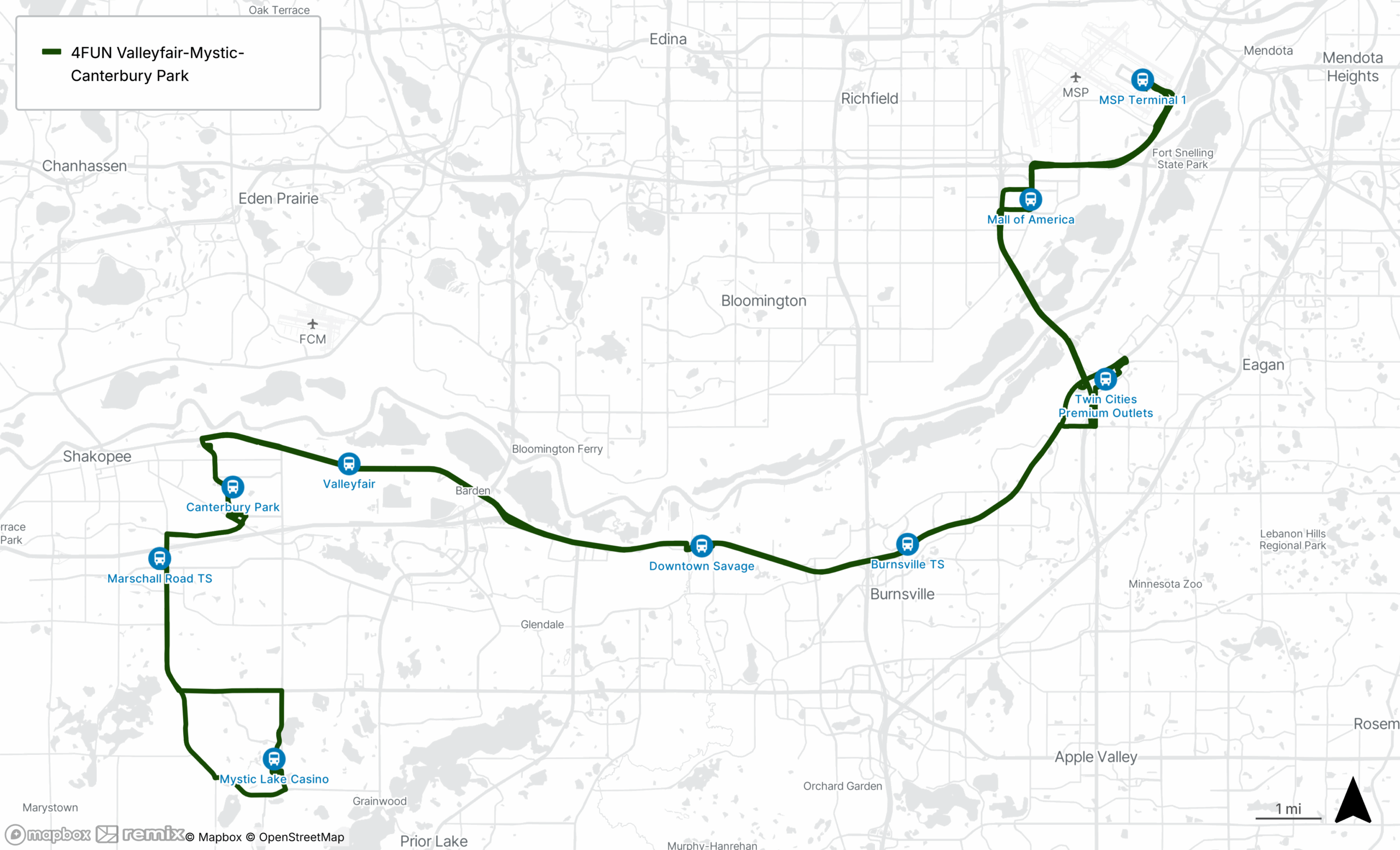 Route 4FUN currently operates between Shakopee and the Mall of America, with stops at Mystic Lake Casino, Canterbury Park, Valleyfair, Burnsville Transit Station, and Twin Cities Premium Outlets. The route operates Thursday – Sunday from approximately March – October. Trips run approximately once per hour.