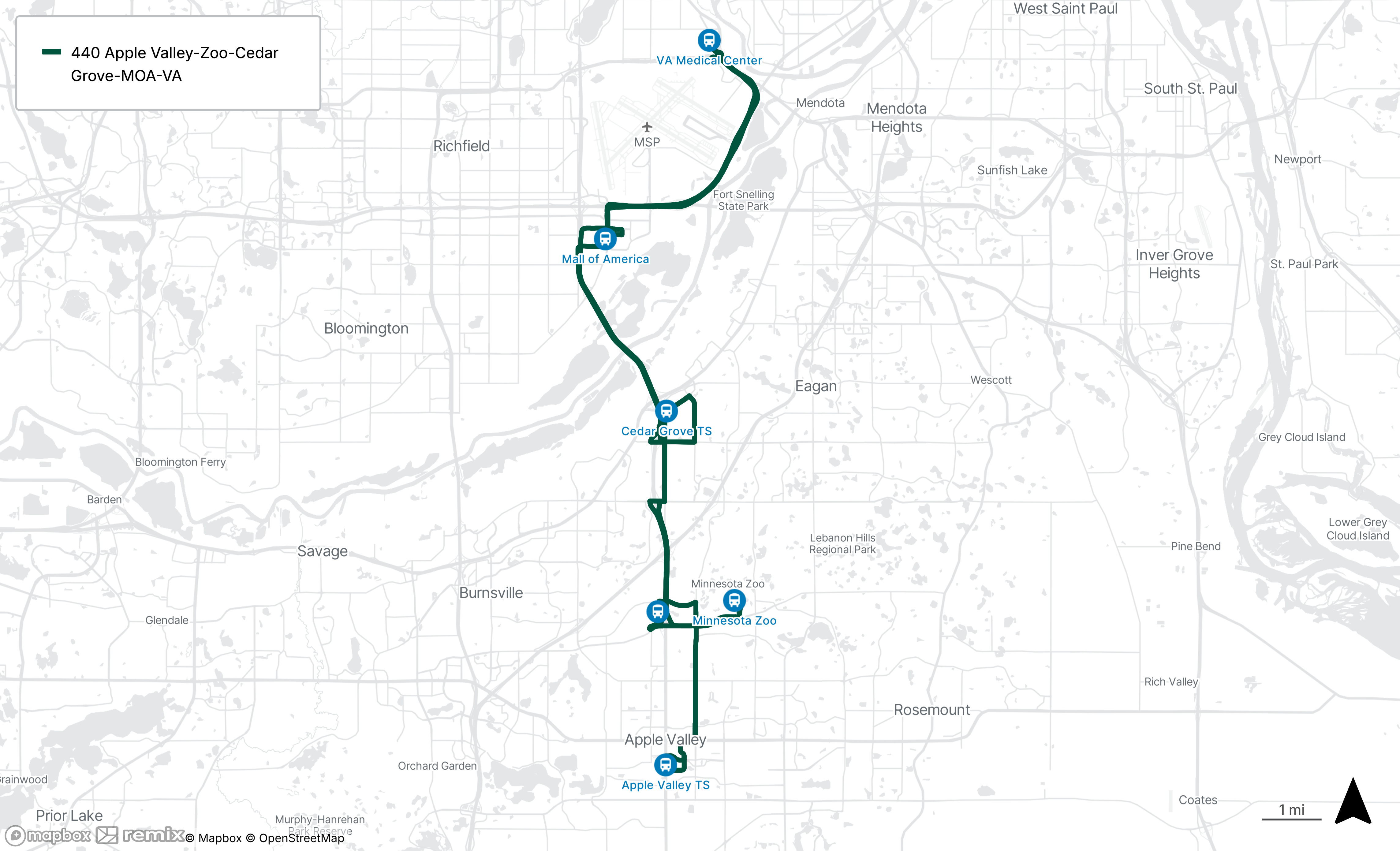 Currently, Route 440 operates every 30 minutes during rush hour with 120 minute service during the rest of the day. The route operates on weekdays only and serves locations including Apple Valley Transit Station, the Minnesota Zoo, Palomino Hills Park & Ride, and Cedar Grove Transit Station.