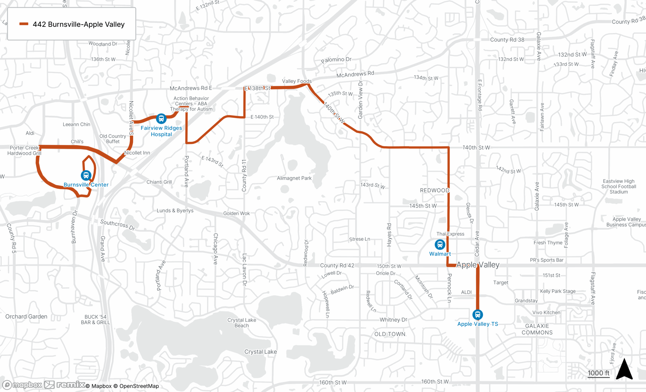Route 442 currently operates every 60 minutes for most of the day on both weekdays and weekends. The route operates between Burnsville Center and Apple Valley Transit Station, also serving Fairview Ridges hospital, then serving locations along the Cedar Avenue corridor, ending at Mall of America.