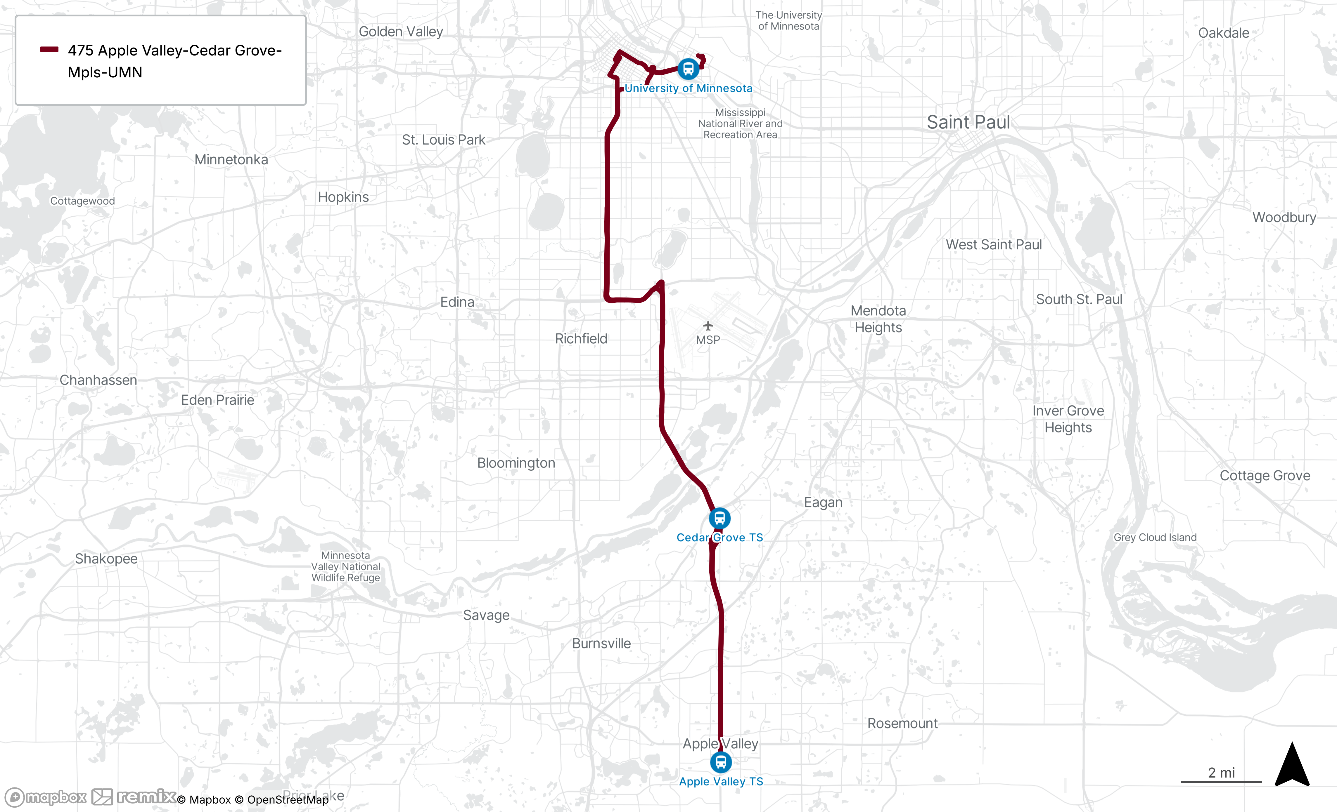 Route 475 provides Apple Valley Transit Station and Cedar Grove Transit Station with service to the University of Minnesota and the Minnesota Zoo.