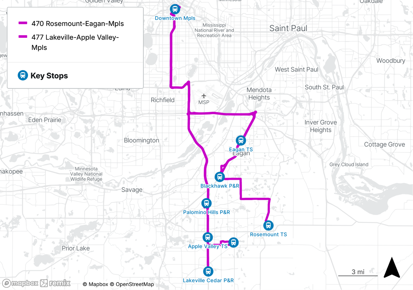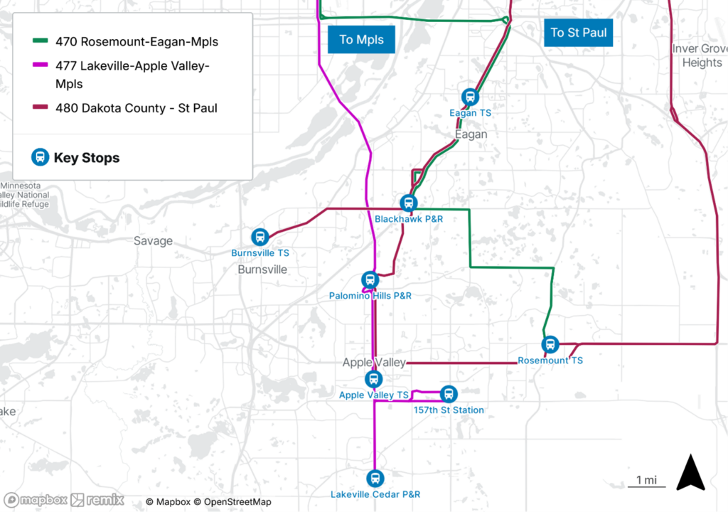 Route 472 will be suspended. Riders at Blackhawk Park & Ride and Rosemount Transit Station will have service available via an extension of Route 470. Riders at Palomino Hills Park & Ride will have service available via a new route 477 P pattern, which will provide trips from 157th Street Station, Apple Valley Transit Station, and Palomino Hills Park & Ride to Downtown Minneapolis.