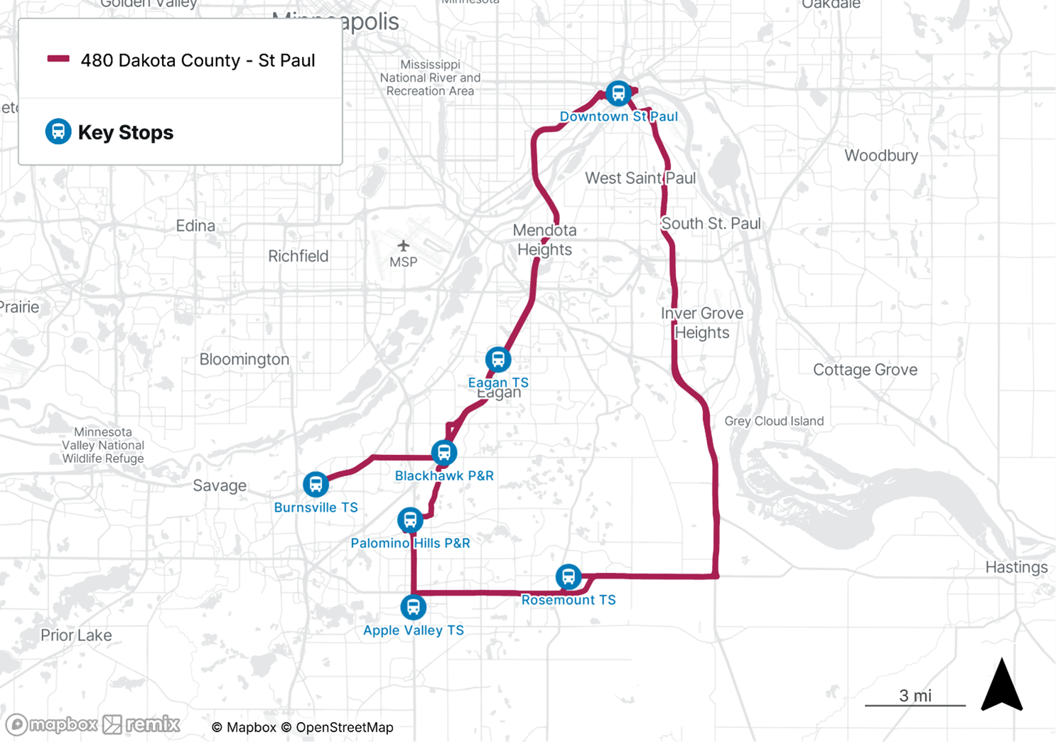 Route 484 will be suspended. Riders at Rosemount Transit Station will have service available to Downtown St. Paul Monday – Thursday via a new route 480 R pattern, which will serve Apple Valley Transit Station and Rosemount Transit Station to Downtown St. Paul.