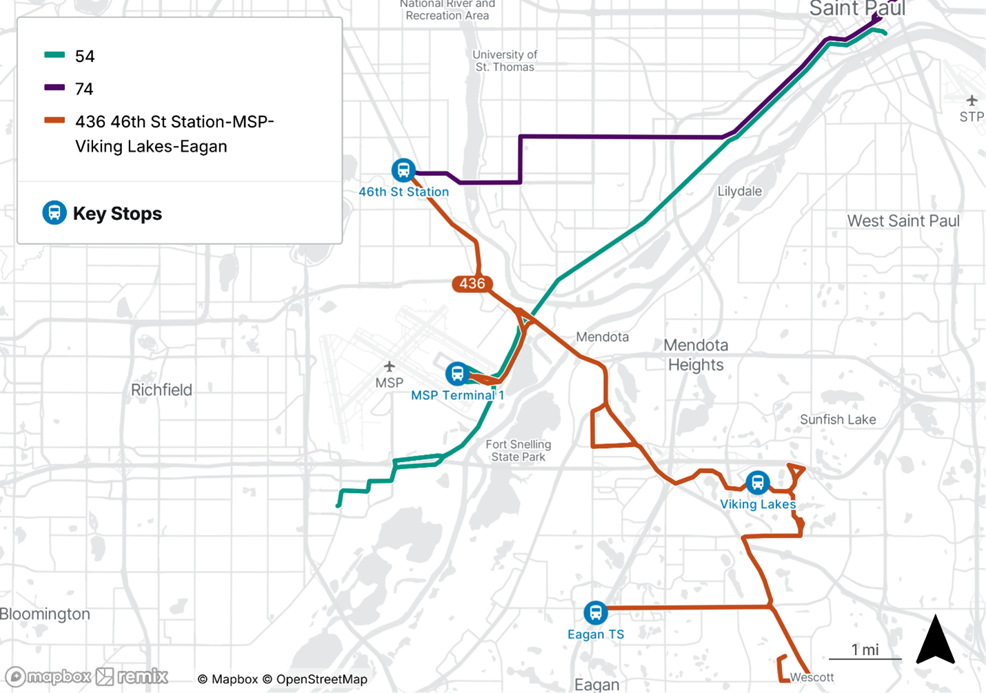 Route 489 will be suspended. Riders can use Metro Transit routes 54 or 74 to access route 436 at 46th Street Station or MSP Terminal 1 Station.