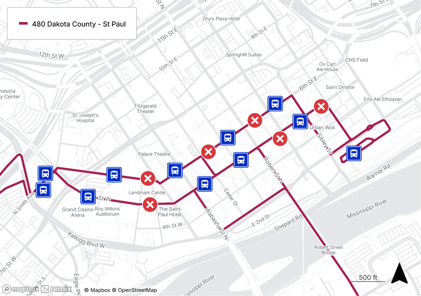 Changes to pickup and dropoff locations in Downtown St Paul will take place to match the pickup and dropoff locations of Metro Transit stops in Downtown St Paul. The following changes to stops will take place: