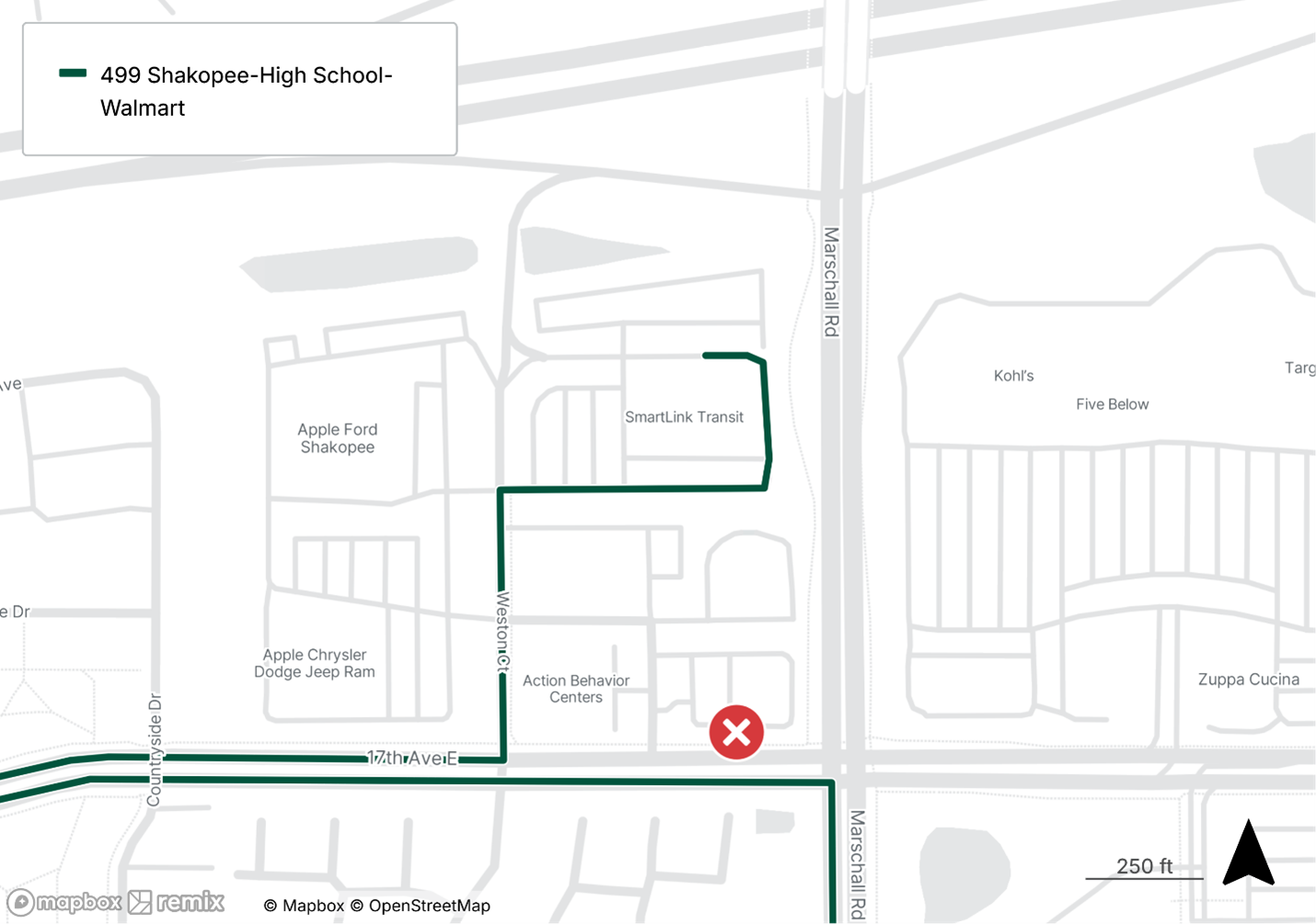 Routing change on Eastbound trips. Stop #31784 (17th Ave at Marschall Rd NW Corner) will no longer have service on Eastbound trips (this stop will remain active on Westbound trips).